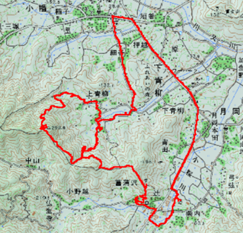 トレランコース案内図にはあまり迷い様もないように書いてあるのだが、実際は分かりにくい。両方とも細い山道の分岐で、そろそろ集落だからどっちを通っても同じと思い左の道を行くと、意外にも先が長かった。それでも道幅のある林道に出て下っているから、行先は上青柳集落のはずだ。
