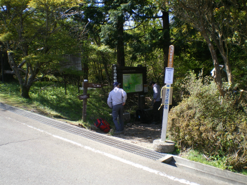 道は次第に登り坂となり、左側に登山道の分かれる登山口に着いた。時刻はちょうど8時、出発して1時間である。WEBにはトイレのある駐車場があると書いてあったような気がするが、路肩に4、5台駐車スペースがあるくらいで、トイレなどは見当たらない。違う場所なのだろうか。