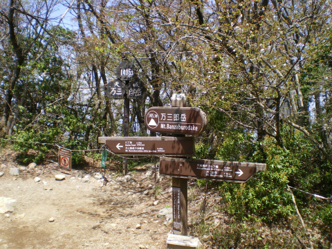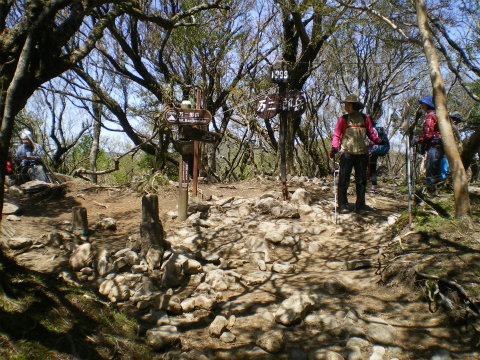 左右に生えている木をみると、シャクナゲが多いようである。ただ、まだ時期が早いらしく、花は咲いていない。20分歩いて四つ辻という交差点になり、ここから万二郎岳に方向を変える。このあたりから、まだそれほど登っていないのに休む人達が目立つ。そういう人に限って大声でしゃべっている。満員のバスに加えて自家用車で駐車場も一杯だったから、普段歩く山とは違って人が多い。