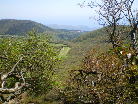 そして、万二郎岳からの下りは1/25000図で見たとおりの急傾斜でいきなり難儀したのだが、鞍部から登り返したあたりで景色が開けて気持ちよかった。いま登ってきた万二郎岳と向かいの遠笠山をはさんで、ゴルフ場のフェアウェイが広がっている。その向こうには青いピラミッド型の大室山と、さらに相模灘を望むことができた。