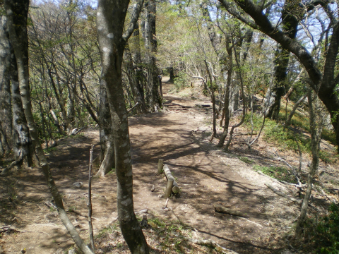 それを除けば、たいへん快適なハイキングコースであった。起伏のゆるやかな尾根道は沼津アルプスではほとんど見たことがなかったのに、ここではしばらく続く。加えて足下が腐葉土というのか、黒土が主体でほどよくクッションが利いて歩きやすい。このまま下山口まで続いてほしいと思う。