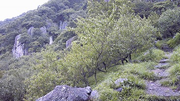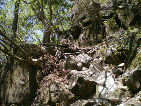 竹林の中を上り始めた登山道は、すぐに自然林になる。足下はガレ場で、水の流れなくなった沢を遡っているようだ。浮いた岩を踏まないよう注意が必要だけれども、滑りやすいということはない。傾斜は、長嶋さんとはいえランニングしていたくらいだから、手を使わなければ登れないということはない。30分ほど登ると、右手樹間から垂直に切り立った岩盤が見えてくる。