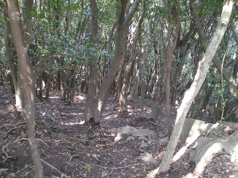 トラバース道が終わると、いよいよ最後の急登である。ここは結構な傾斜で、しかも鎖もロープもない。幸いに木が密集しているので、手がかりには困らないのと、ピンクテープや太いゴム輪が進路を指し示してくれる。上を見るとそれほど登らなくてもよさそうで、最後の大岩を越えると平らな道に出た。草むらを抜けると、下草に覆われて広くなっていて、展望が開けている。