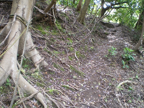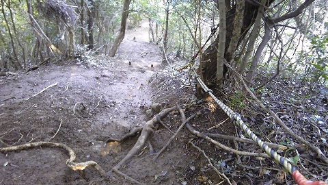 登りも急坂だったが、下りも相当の急坂である。再びロープが登場する。路面は引き続きよくない。難所では後ろ向きに下らざるを得ない。しばらく下ってようやく緩やかな稜線に出た。部活の声が後方に聞こえるようになったので、かなり距離を稼いだようだ。しかしほっとしたのもわずかの間で、再び急斜面の登りが待っている。