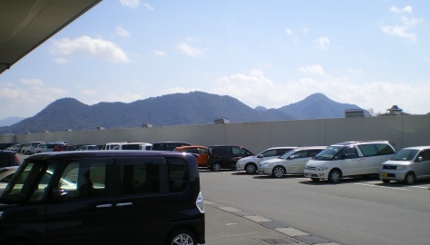 沼津港から見た沼津アルプス。海のすぐ近くに山が立ち上がっている。駐車場の脇は防波堤、その向こうは海。