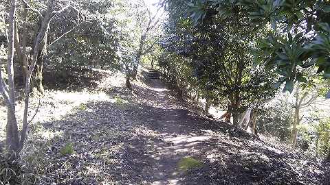 ようやくこう配が緩やかになって、右に下る道がある。「塩満方面」と書いてある。わずかなアップダウンの続くこの付近は、麓の塩満集落の入会地であったようで、塩満広場というぽっかり開けた空間がある。そのあたりには第二次大戦時に本土決戦用に掘られたのか、海に向けた地下砲台の跡もある。