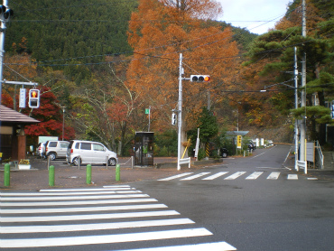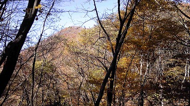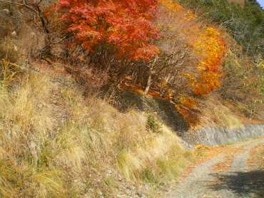 さて、写真を撮りつつ上がってくると、集落の一番上あたりで舗装もなくなり、砂利道となった。そのあたりに何台か車が止まっていて、鷹ノ巣山登山口がある。ちょうど紅葉がみごとなあたりから登山道に入り急勾配が始まるのだが、もう11時になってしまった。
