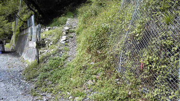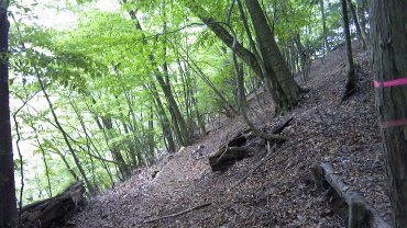 ハードと評判の導入部の急坂、下の写真のように林道とは明らかに勾配が違う。石垣を組んで斜面を斜めに進むようになっているので、本来の角度よりはゆるくなっているが、それでもきつい。おそらく何件か続いた滑落事故を受けて、登山道を整備したと思われる。うれしいのは、ひと気のない登山道にありがちな、雑草が伸び放題で足下が見えないということがないところ。