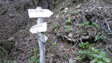 15分ほど進む間に、2つの道標を通り過ぎる。道が濡れているのは「一杯水」という地点らしいが、集めて飲めるほどの水量ではない。勾配が少しきつくなったがどんどん登っていくと、目標の「水源巡視道分岐」に着いた。休憩地点から20分ほど。登山道から通算では1時間半。コースタイムでは30分なのに。