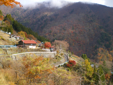 景色は素晴らしい。南方向に開けた斜面に点在する集落で、戸数は二十軒くらいあるのだろうか。はるか下にいま通ってきた峰谷と、峰谷から西に登ったあたりに峰集落(川苔山のとは別。このあたりではよくある地名である。)を望む。左手には鷹ノ巣山から榧(かや)ノ木山、倉戸山に至る稜線が、緑、黄、赤、茶色に染め分けられている。