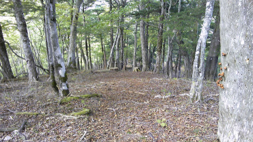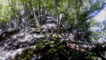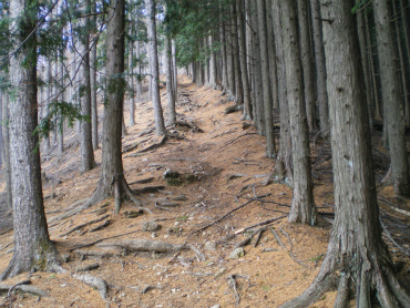 小休止の後、再び登りにかかるが、息がきれるのは相変わらずである。なかなか足が前に進まない。足下は落ち葉がガレ場の上に積もっていて、強く踏み込むと時々浮いた石を踏んでしまう。木の根が地面から出ているところも多く、安定しない。考えていたよりも、かなり難しい道である。