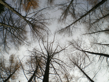 あおむけになって寝転ぶと、落葉したカラマツがなんともいえない風情である(下の写真)。登山道のすぐ脇の場所なのだが、単独の人がひとり通っただけで他には誰もいない。聞こえるのは鳥の声だけである。午後1時になり、ちょっと寒くなったので出発。