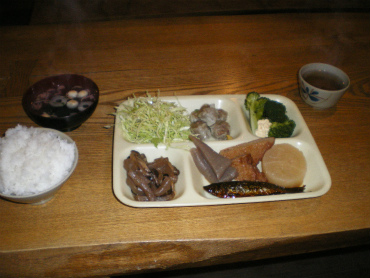 夕飯は食堂に1人分だけ用意されていて、聞いてみると泊り客は私ひとりだった。私だけのために悪いような気がしたが、小屋番のお兄さんはウィークデイの間泊まり込みなのだそうだ。夕飯はおでんに岩魚の甘露煮、シュウマイ、キャベツとブロッコリー、山菜とこんにゃくの煮物と温かいご飯と味噌汁。冷えた体に温かい食事がありがたい。