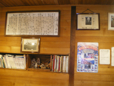 食堂の壁に貼ってある三条の湯の由来と、初代小屋番の写真(三条の湯HPにも載ってます)。