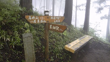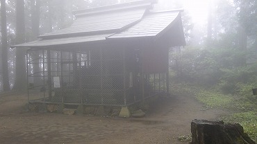 この神社は延喜式にも載っている歴史ある社であるが、いまや金網に囲まれているところをみると、常駐する神職はいないようである。ハイカー用に置かれた丸太に座って小休止する。ただし小雨がぱらつくのであまりゆっくりもできない。夏なのでホットコーヒーは持ってこなかったが、温かいものがほしいくらいの陽気である。