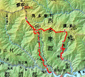この日の計画は、8:30に奥多摩駅を出て、愛宕神社を経由して鋸山に11:00に着き、お昼休みの後2:00には麓に下りお風呂に入って3:25のホリデー快速に乗るというきわめておおざっぱなものであった。普段はもう少し1/25000で予習して、途中の小ピークやそこまでの目標時間を設定しているのに、若干の経験を重ねたこともあって、油断していたようだ。