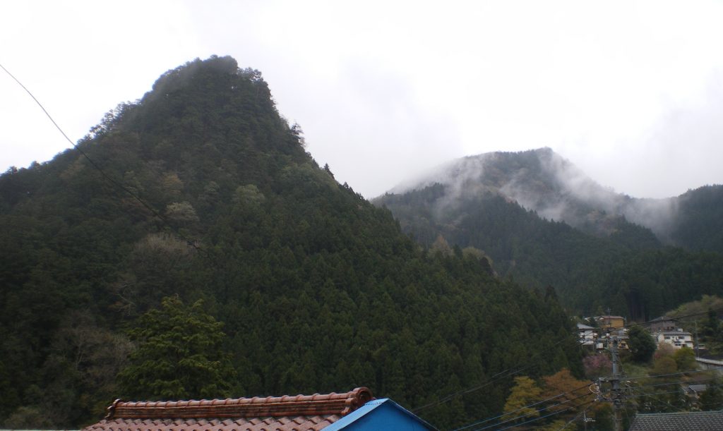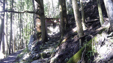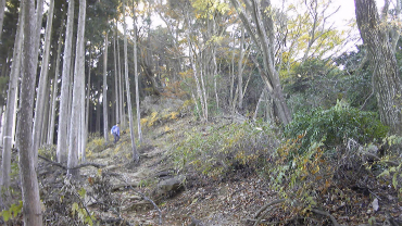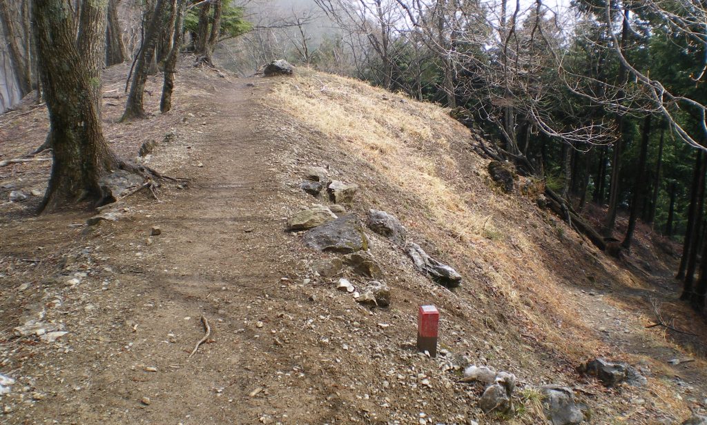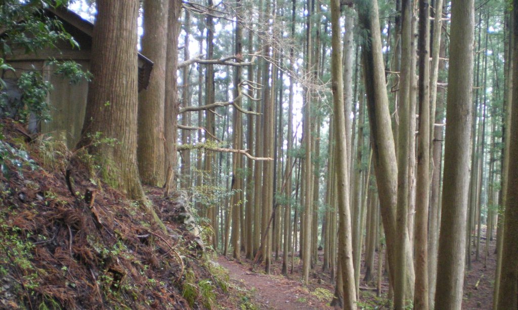 いよいよ登山道に入る。勾配はそれほど急ではなく、路面も落ち葉で歩きやすい。20分ほど歩くと突然廃屋が登場したのには驚いたが、ここから杉林の下方向を見るとはるか下に民家の屋根と道路が見える。地図で確認すると小袖という集落はこの下のようなので、数十年前にはここにも人が住んでいたのだろう。