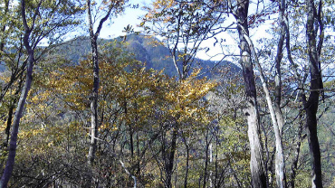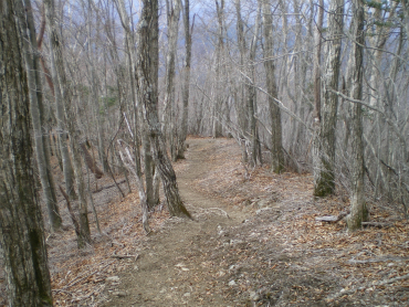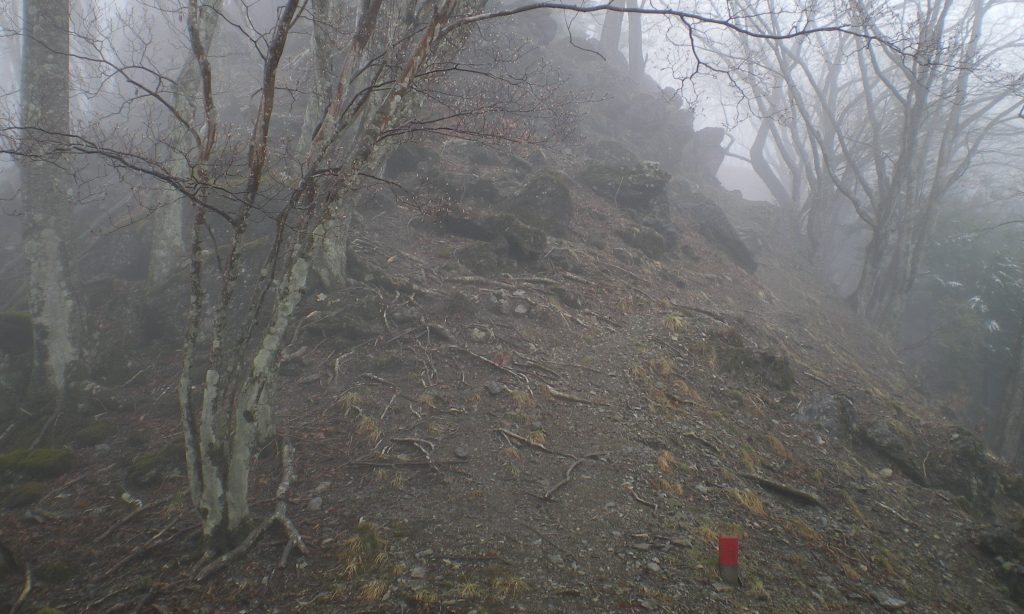 小さな谷を挟んで左に右に巻き道は続く。ほとんど平らなので順調に進むのだけれど、8時半を過ぎても避難小屋が見えてこない。帰りの峰谷発のバスは12時55分、峰谷まで3時間とみて、10時前には下り始めなければ間に合わない。逆算すると、8時半には避難小屋に着いてリュックを置き、鷹ノ巣山に向かうという計画だったのだが、ちょっと無理そうである。