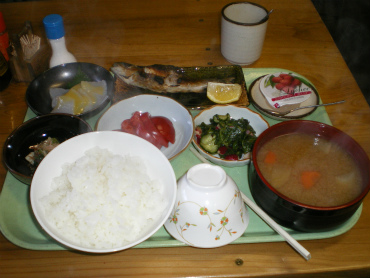 この日の夕食には、岩魚の塩焼きが付きました。味噌汁は根菜がいっぱい。