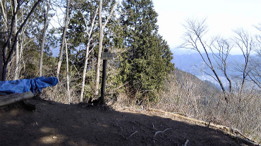 金毘羅神社の本殿(といっても小さい)まで少し登り、さらに巻き道を分けてひと登りすると標高646mの三室山の頂上。ここまで1時間ちょっとで、標高差の約3分の2をあっさり登り切ってしまった。WEBでは展望がないと書いてあったが、北側に風景が開けて多摩川が方向を変えるあたりが見える。木々の葉がそろわないこの時期だからかもしれない。