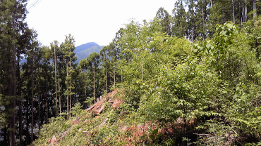 さて、避難小屋から奥集落までの浅間尾根であるが、2012年秋に登ろうとしたことがあったが、あまりの急傾斜と、行きの峰谷橋から奥集落まで時間がかかりすぎたことで、標高1299m付近で断念してしまった。その前例があってちょっと心配したが案の定、尾根の上の方はなだらかなところも多いのに、途中の造林帯あたりから急勾配が続く。なるほどこれはきつかったろう。