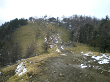 途中で登山道が崩れている箇所があっていったん舗装道路に上がり、再び登山道に入る。歩き始めて2時間、カーブを過ぎると突然大きな建物が見えた。上日川(かみひかわ)峠のロッジ長兵衛である。ここまでは車で入れるので、かなり人が多い。逆にいうと、駐車場を起点とした登山道を外せば、あとは静かな山道ということでもある。