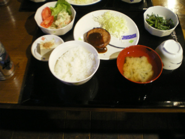 雲取山荘名物・ハンバーグの夕食。手作りポテトサラダとトマト、わらびの塩漬け、冷奴も付いて、ごはんは大盛りでおかわりしてしまいました。