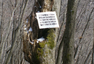 「ここは標高1150mです。」と看板が貼ってある。標高差で、石尾根までのちょうど中間点ということになる。この看板によると、七ツ石小屋まで1時間10分、ブナ坂まで1時間半、雲取山頂まで2時間45分だそうだが、コースタイム通りとしても山頂に3時過ぎ、宿に着くのは4時になる。(後から、この看板は全く参考とならなかったことが判明する。)