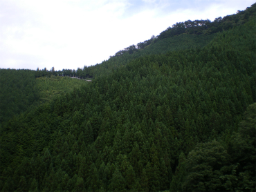鋸山林道を半分くらい来たあたりで、上方を振り返る。ガードレールの見えるあたりから、手前の山をずっと回り込んで下りてきました。
