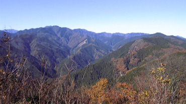 有害動物(鹿と猪)対策の銃声が時折響く中、最初はなだらかだった登り道が徐々にきつくなって行く。展望はなかなか開けない。この鋸尾根は大岳山から続く北側の尾根になるので、日が当たらなくて暗いのである。途中で、石尾根方向に景色の開けた場所に出た。同じくらいの高さに森の中に少しだけ家が見えているのは、以前歩いた城とか三ノ木戸の集落と思われた。