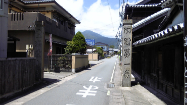坂東駅の前、まっすぐ伸びる道を進み突き当たりで左に折れる。門前通りと言う名前の商店街であるようだ。しかし、猛暑日の昼下がり、真上から日光が降り注ぐ中、歩いている人は誰もいない。交差点にはお遍路用の道しるべが描かれている。写真を撮ったりしながらゆるゆると進むと四つ角に差し掛かる。