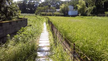 信号を直進してしばらくすると、舗装道路から右に折れる細い道に「→金泉寺」の表示がある。その方向を見ると、田んぼの脇の畦道を通って行くようだ。道を覆って草が伸びているのは気になるが、これからたびたび登場するという「遍路道」であろう。まずは経験ということで、この道を歩いてみる。