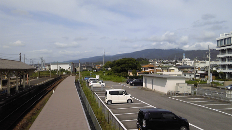 藤井寺から鴨島駅までの道は、本降りの中ずぶ濡れで歩きました。電車に間に合わないかと思った。駅から南側を振り返ると、雨で山の方向はすでに見えない。