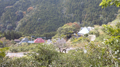 浄蓮庵から左右内集落までの下りは傾斜がきつく、なかなか着かない。40分ほどかかって、ようやく集落の屋根が見えてくる。
