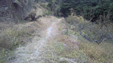 柳水庵を下りてすぐの林道は自動車も走っていて、道路の上には「吉野川市」と表示がある。へんろ道は林道をまたいで南側に伸びていて、かなりの急坂である。しかし次第に傾斜が楽になり、ほとんど遊歩道のような道になった。