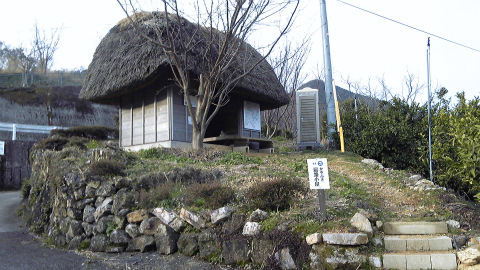 有名な善根宿「寿康康寿庵」。沼江への登り坂の前にある。里山再生事業本部との表札も掲げられており、中には流しや布団が備えられている。