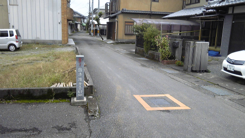 すると、ちょうど先ほどの工事中の道路のあたりに、先ほどとは逆向きに通行止めがされていてガードマンがいたので、たまたま通行止め解除のあたりで左折したようである。ここで正規の道に復帰する。そこからすぐに太い通りを横断し、案内にしたがって古い住宅街に入る。