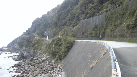 四国のみちルートは海岸線をたどるルートで景色はたいへんよろしいが、砂利を満載して飛ばして行くトラックと、右は切り立った崖、左は海までさえぎるもののない崖で、神経を使う道である。それと、せっかくの景色を落ち着いて見るベンチとか休憩所がないのは残念なことであった(ロケーション的に駐車場を作れないということもあるのだろうか)。