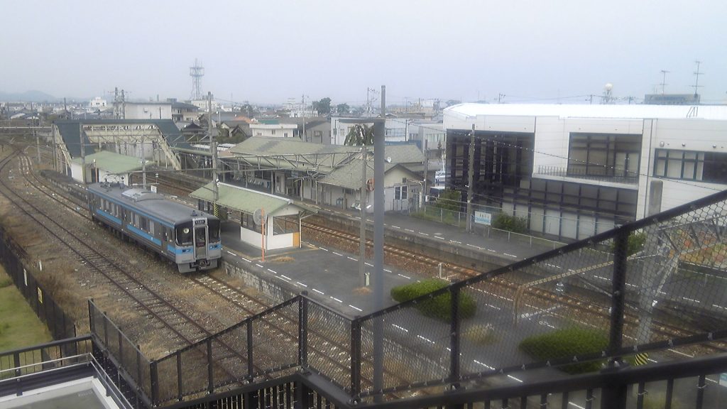 今回のスタート地点、JR壬生川駅。平屋の緑屋根が駅舎で、右の白いビルが行政施設。乗ってきた各駅停車は特急が発車してもまだ止まっている。