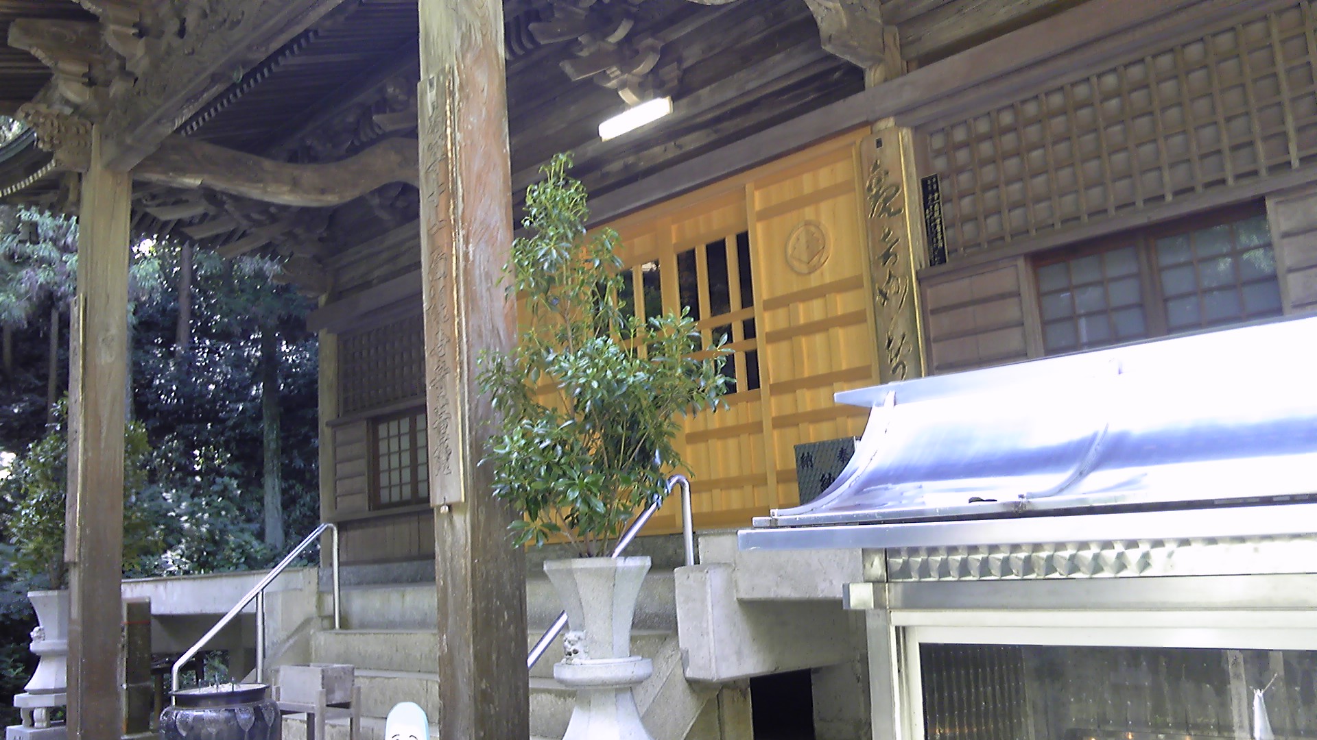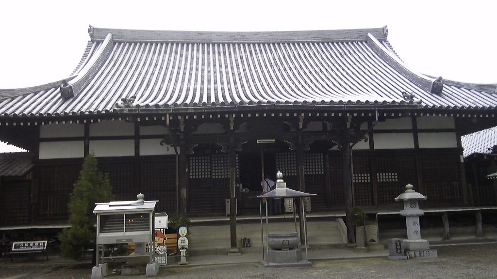 山門の向こうから本堂が見えてきた。昭和50年代に本堂を大改装し、八十八ヶ所では大変珍しい鉄筋コンクリートの巨大な本堂である。本堂には右側の階段から2階に入り、スリッパに履き替えてご本尊のいらっしゃるステージ前に進む。後ろには備え付けの客席があり、コンサートでもできそうである。