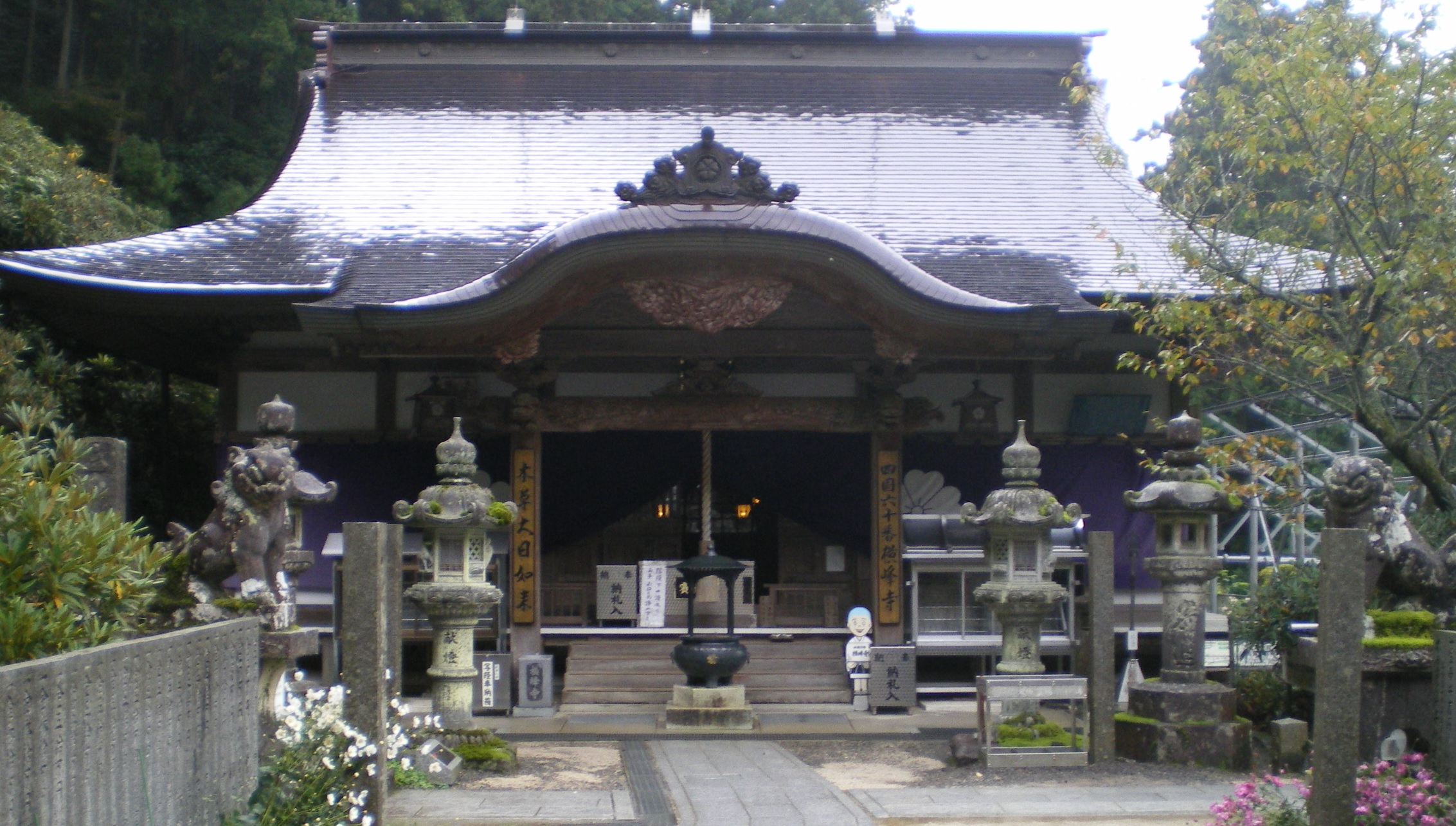 本堂は間口が広く、たいへん立派である。戸が閉ざされていて、ご本尊の毘沙門天像を見ることはできなかった。大師堂は本堂のはす向かい、やや小ぶりで、国道沿いの通用門近くにある。