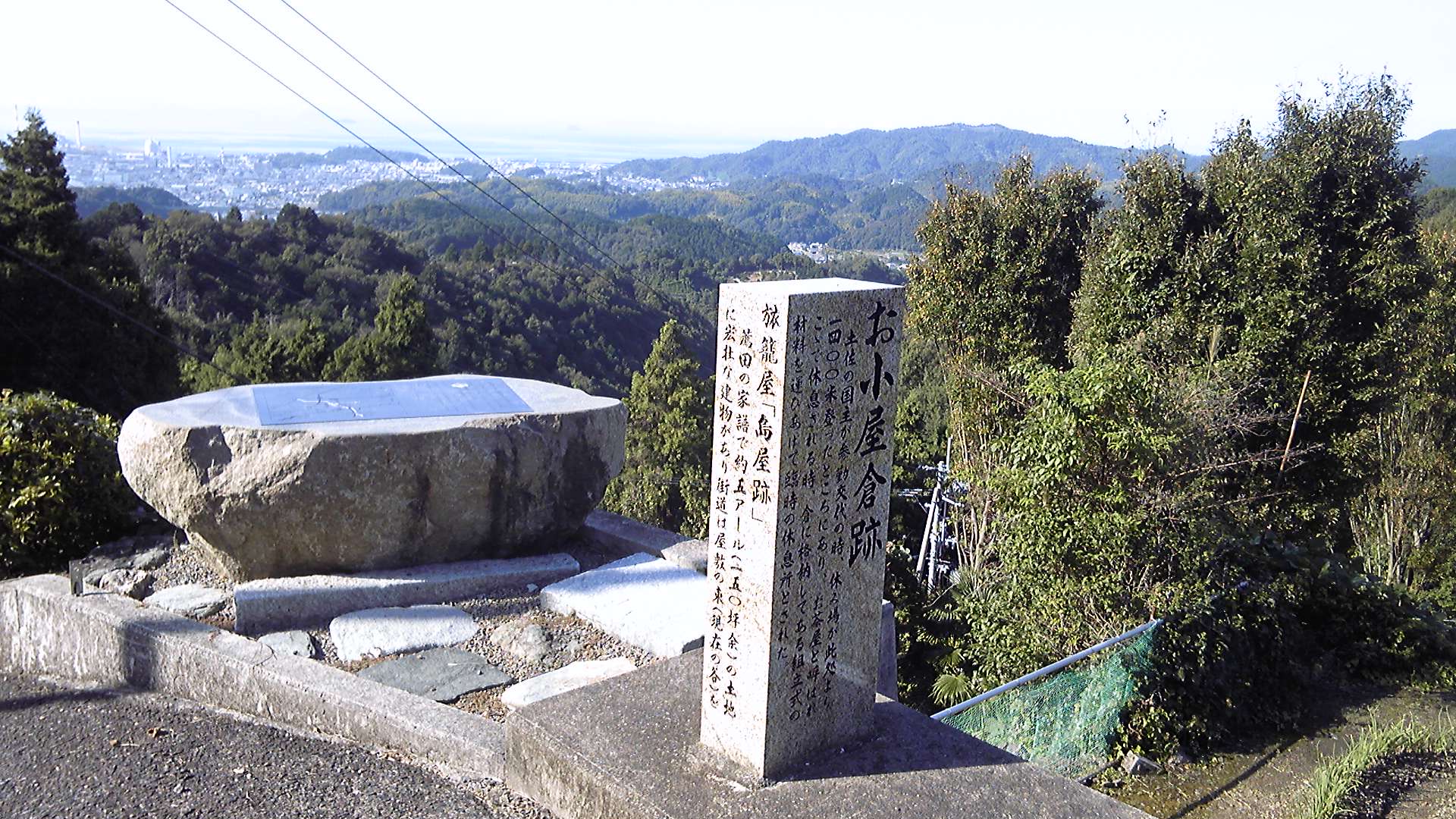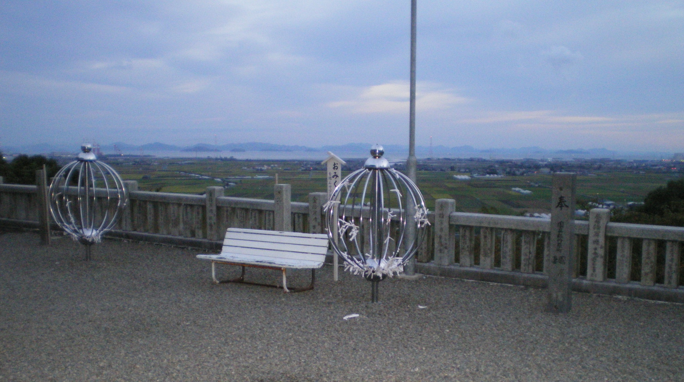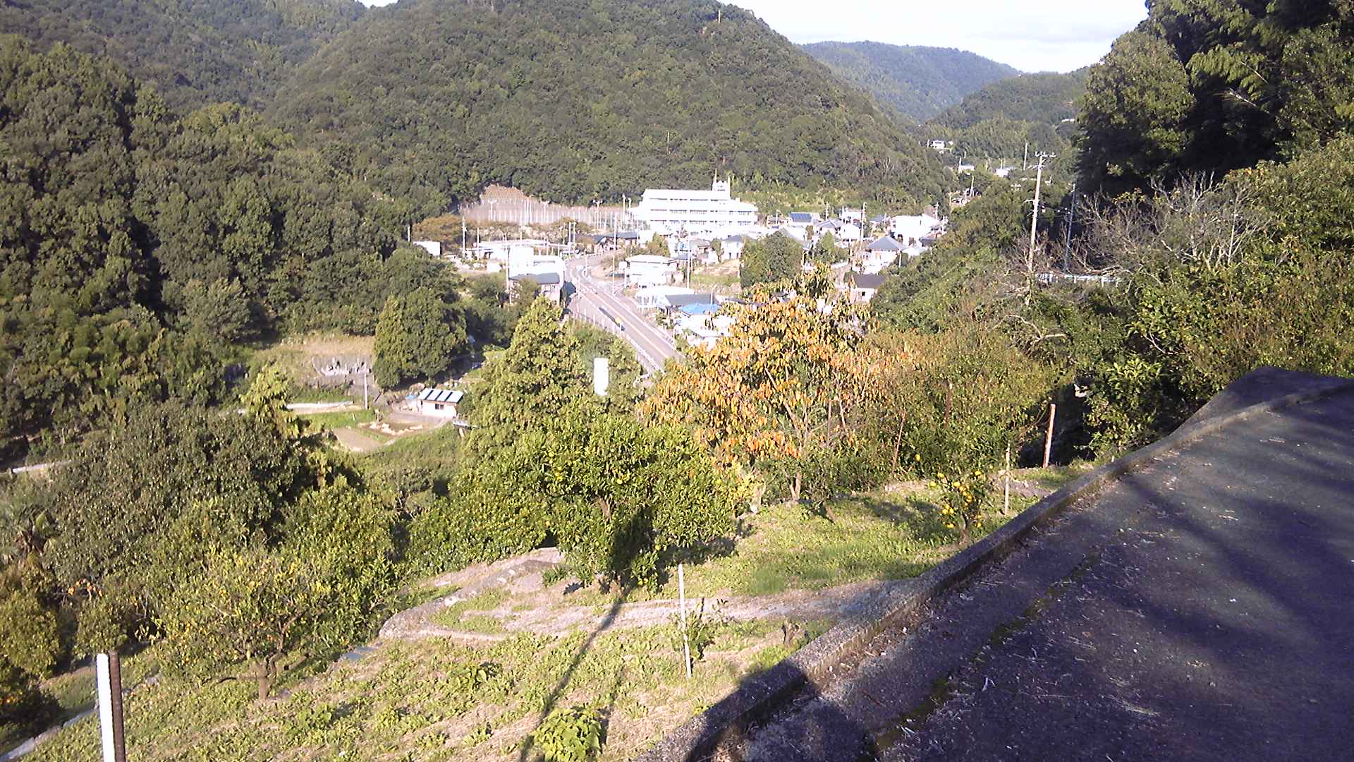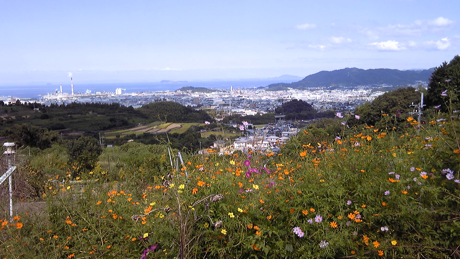 眼下に広がるのはみかん畑、その向こうには水田があり、住宅街、町と続いて海沿いには工場の煙突が並んでいる。胸がすくようないい景色である。言葉もなく見とれていると、下の畑から誰かの声が聞こえる。「ちょっと待ってな」と聞こえたような気がした。時間にも余裕があるので、ベンチに座っていい景色を眺めさせていただく。