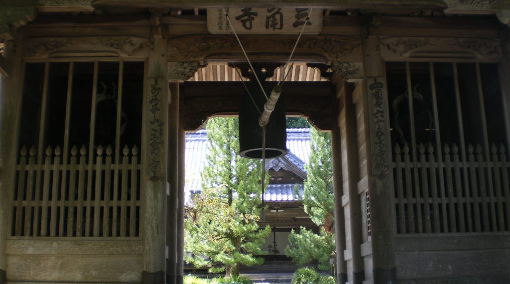 登山道を登り、合流した車道を歩き、さらにはるか上まで続く石段を登り切ってようやく三角寺の山門であった。山門の下には鐘がつるされていて鐘楼を兼ねている。山門には横書きで「三角寺」と墨書されている。