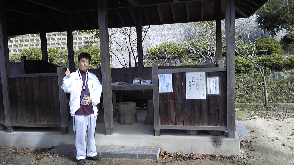 1時間前にファミマで冷たいものを食べたので、こちらでは温かいお湯と、みかん、バームクーヘンなどをいただく。食べながらお話をお伺いする。休日にはこうしてボランティアをしているが、歩き遍路の人はそれほど多くないし、公園の奥まで来ないで通り過ぎてしまう人も結構いるということである。