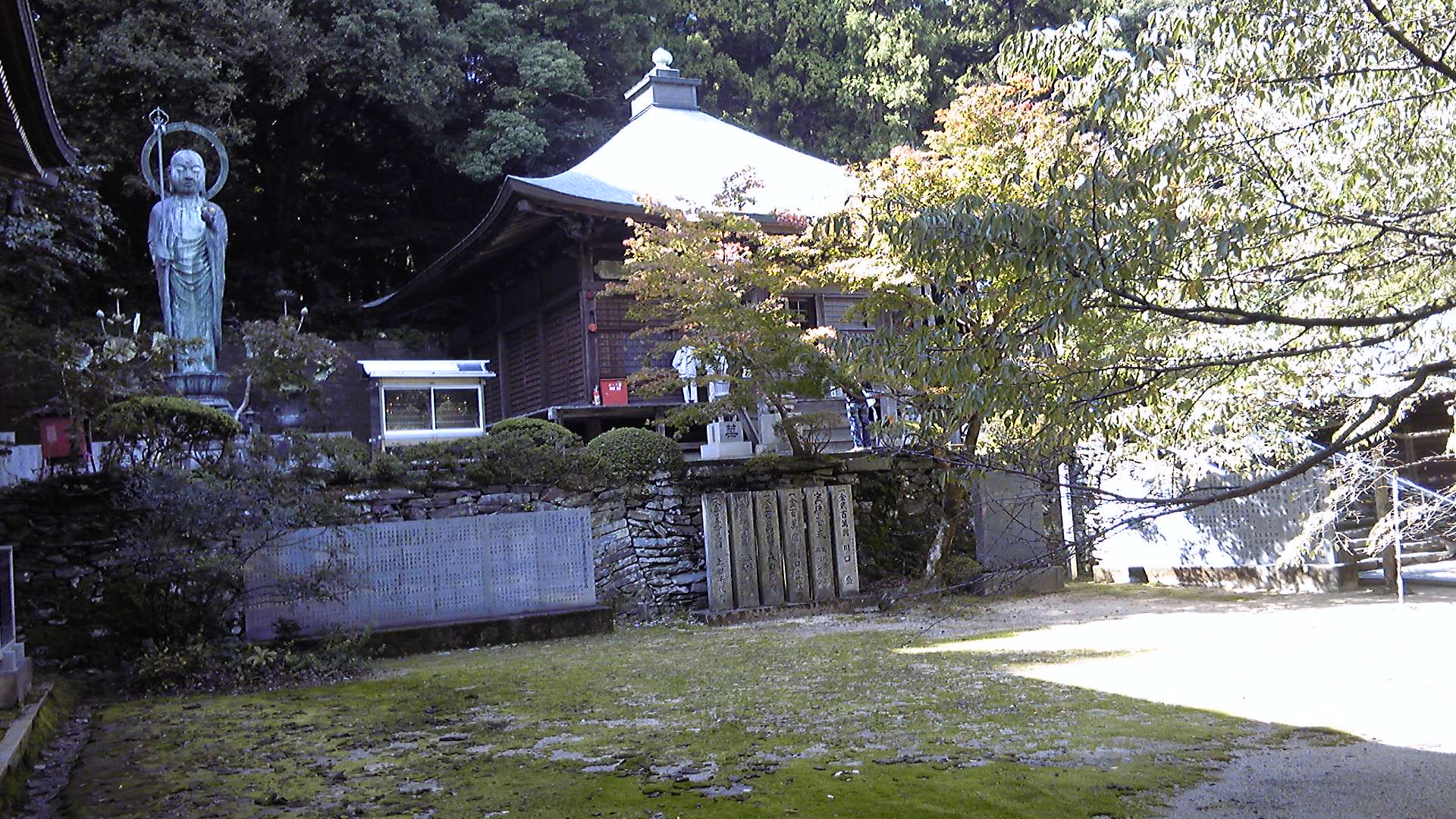 山門の奥に庫裏があり、本堂・大師堂は左手の奥まった場所にある。かなり高くまで登ってきた割には、広い空間が開けている。山門の左が南になるので、本堂・大師堂の方に太陽があってたいへんまぶしい。本堂と大師堂の間には、地蔵菩薩立像が置かれていた。