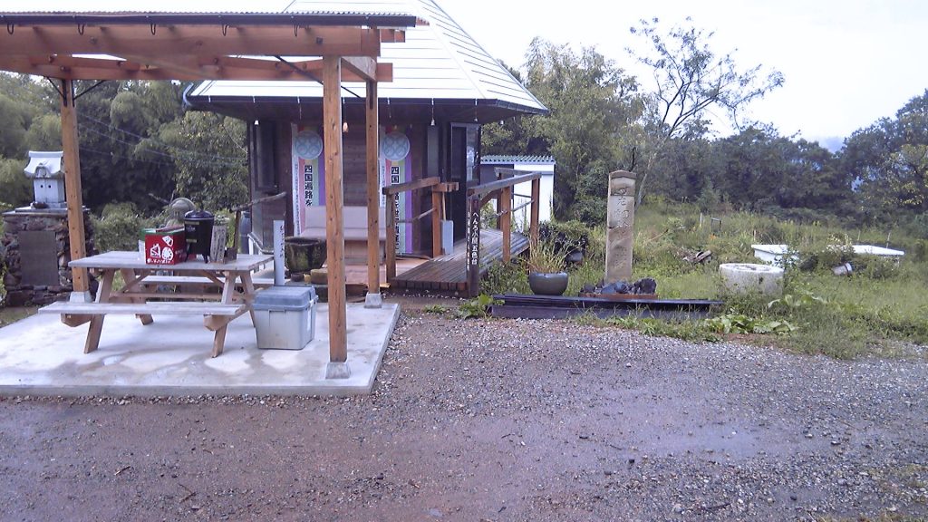 引き戸を開けて中に入ると、作り付けの椅子に座布団が敷かれ、テーブルが置かれている。トイレと飲み物の用意もある。これだけ立派なへんろ小屋はあまり見たことがない。にもかかわらず、約2時間強い日差しの中を歩いて来たので、冷房がないと暑いと罰当たりなことを思ってしまった。