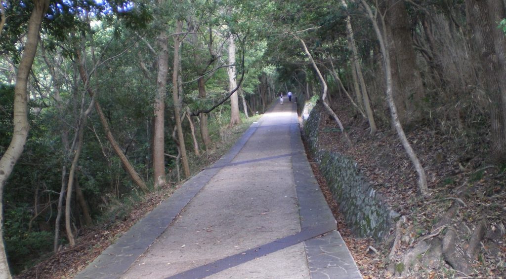 ようやく腰を上げて、小学校脇の坂を案内表示に従って登る。屋島寺への登山道は公園の遊歩道のように始まっていた。最初は車両も通行できる道だが、やがて歩行者専用の細い道になる。