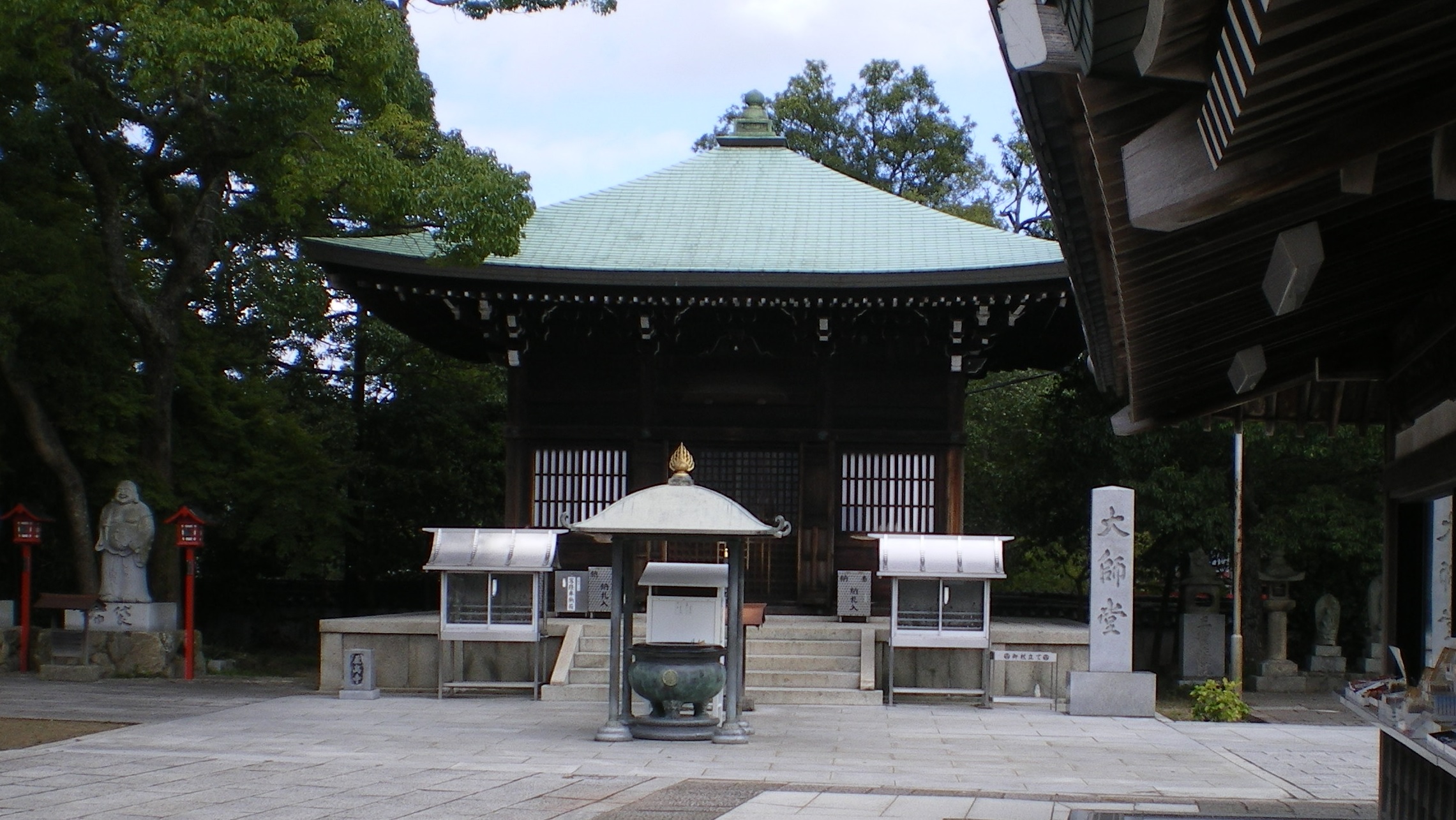 では大師堂はどこにあるかというと、多宝塔や五剣山を模したオブジェとともに、本堂エリアから少し奥に進んだ一角にある。この一角がまさにすがすがしい雰囲気である。幸いベンチがいくつか置いてあり、静かな時間を過ごすことができる。