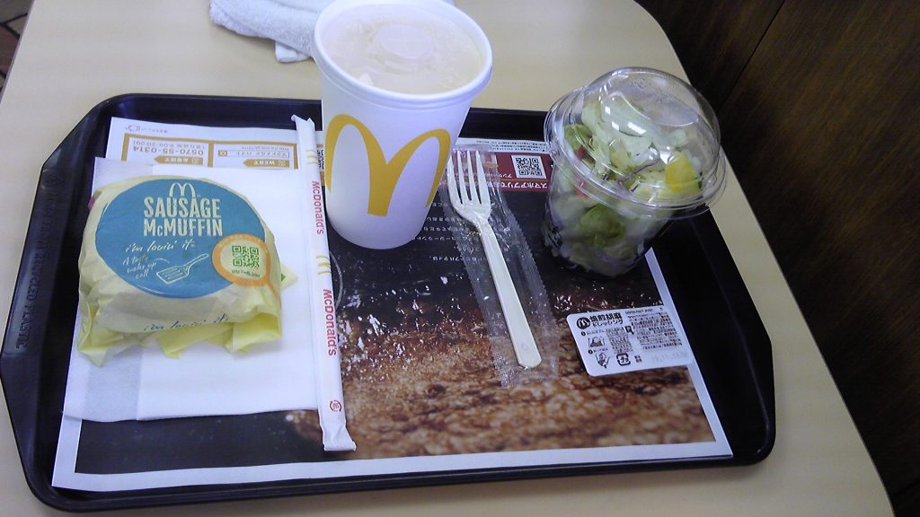そういえば、今回の区切り打ちですでに4泊したが、肉類を全く食べていない。ハンバーガーが食べたいなと思ってオーダーすると、なんと朝なのでハンバーガーはやっていない。「ハンバーガーに近いものですと・・・ソーセージマフィンはいかがでしょう」ということなので、セットでお願いする。