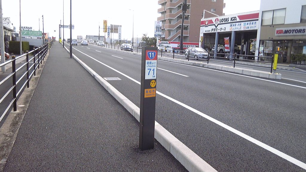 栗林公園から屋島へ、斜めにショートカットして国道11号に出る。ここからは㌔ポストがあるのでペースを計ることができる。